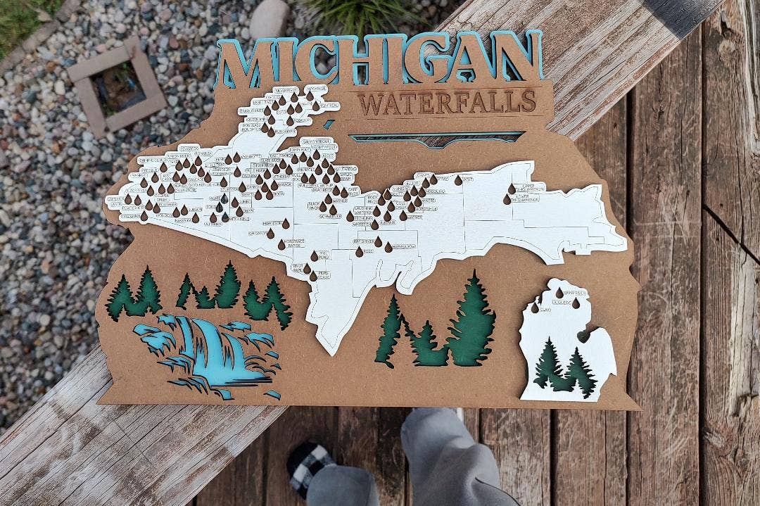 A nice wall display the top 100 waterfalls in Michigan. This includes custonization and cutouts so you may add a raindrop (included) in the display when you have visited one or you can just add all the raindrops to the wall hanging. Has hangingholes cut in the back for easy hanging. This is a three layer design